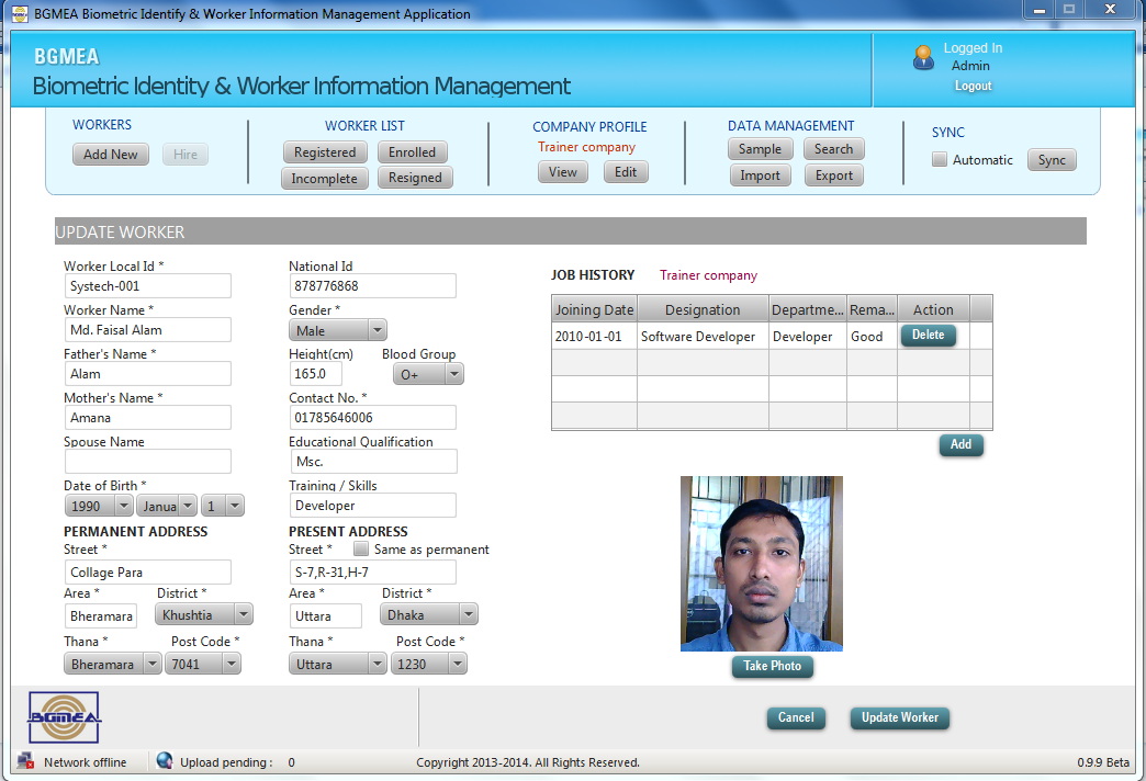 Bio-metric Identity and Worker Information Management System is a unique software with cloud provisioning that is mandatorily using by 2600+ ...