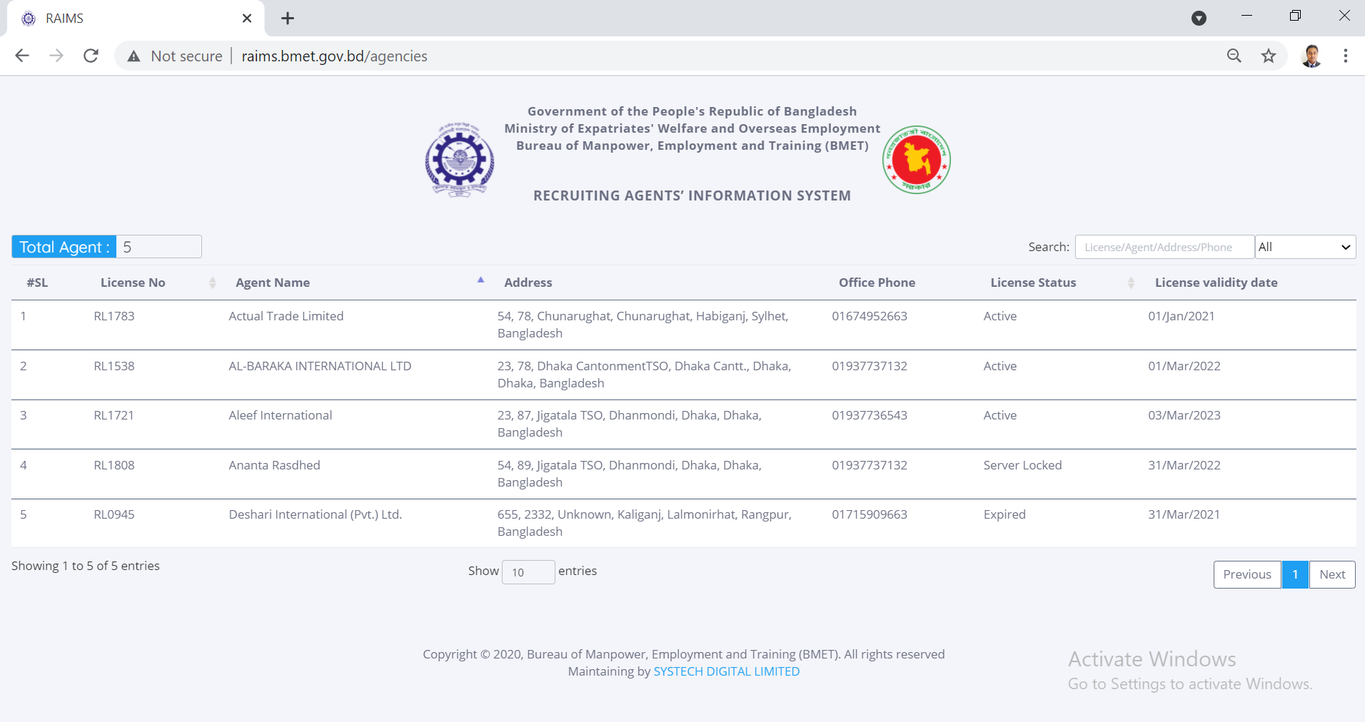 RAIMS is a cloud-based automation system to manage 1600+ recruiting agencies with track records and an up-to-date performance dashboard in the migration sector. The system facilitates of Bureau of Manpower, Employment and Training-BMET, the Ministry of Expatriates’ Welfare and Overseas Employment, Agencies, and overseas employees with up-to-date data and helps in decision-making.