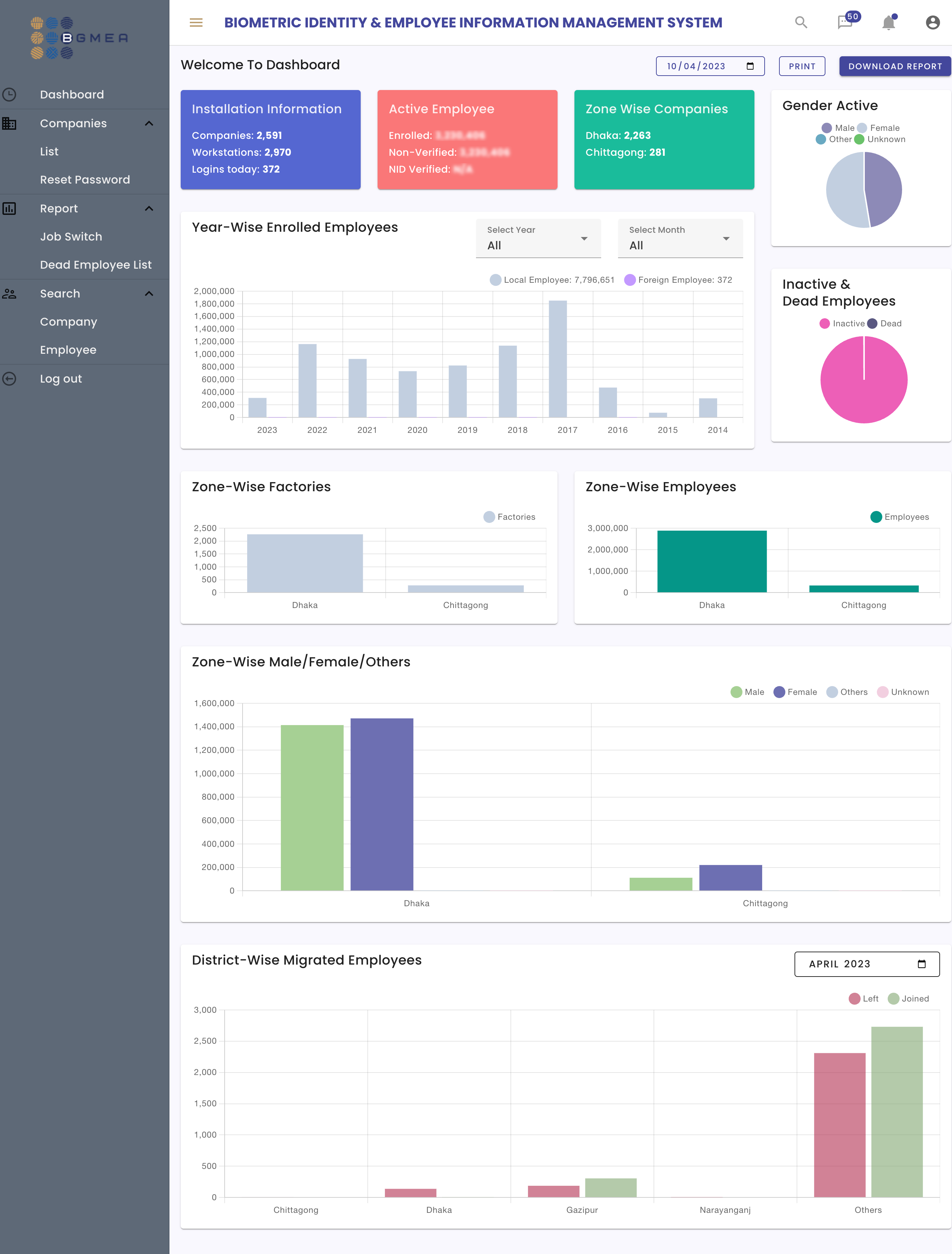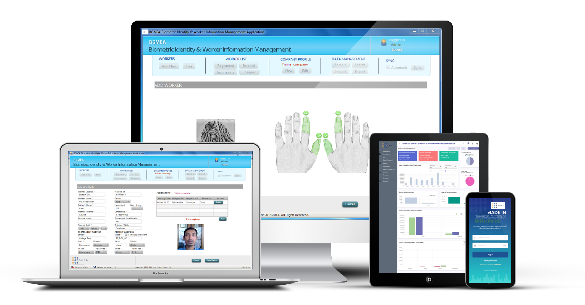 Bio-metric Identity and Worker Information Management System is a unique software with cloud provisioning that is mandatorily using by 2600+ readymade garments factories all over Bangladesh to manage all RMG workers. There are data of over 7.5 million employees enrolled until June 2023. All data of workers including bio-metric information and photo are stored in factory software that syncs with cloud software for identification and verification purpose among all factories and centrally governing by BGMEA and the Government of Bangladesh.
